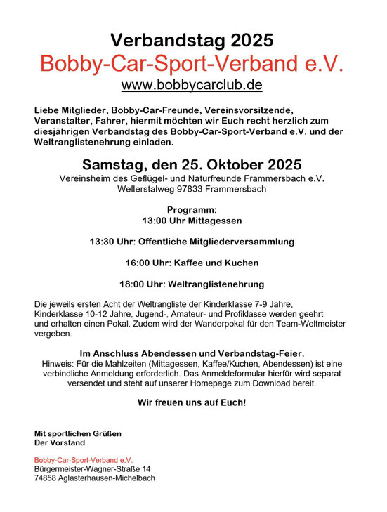 Der Verbandstag des Bobby-Car-Sport-Verband e.V. mit u.a. Mitgliederversammlung und Weltranglistenehrung findet dieses Jahr im Vereinsheim des Gefllügel- und Naturfreunde Frammersbach e.V. im Wellerstalweg in 97833 Frammersbach statt.